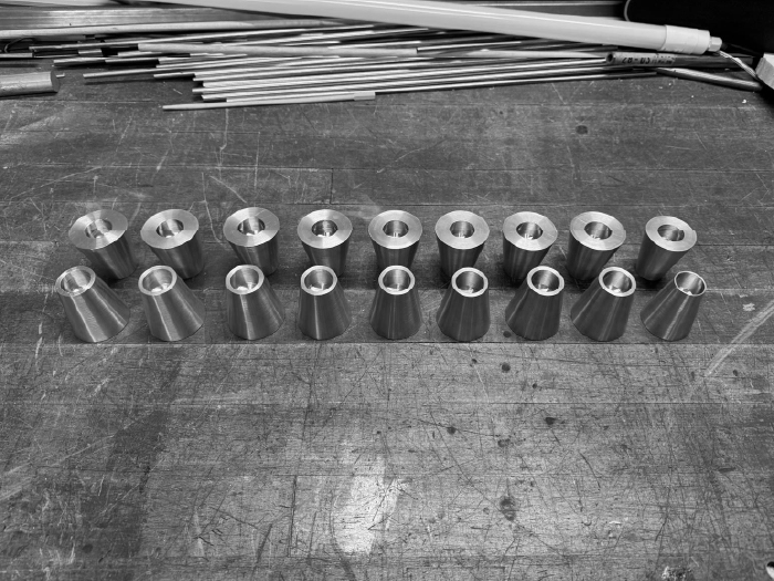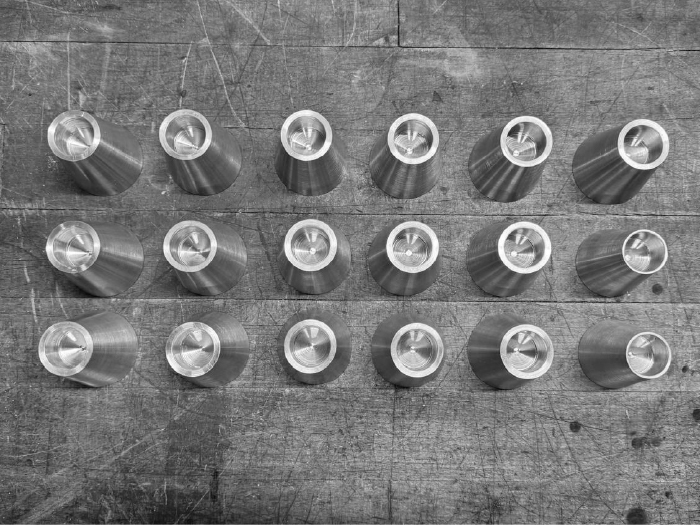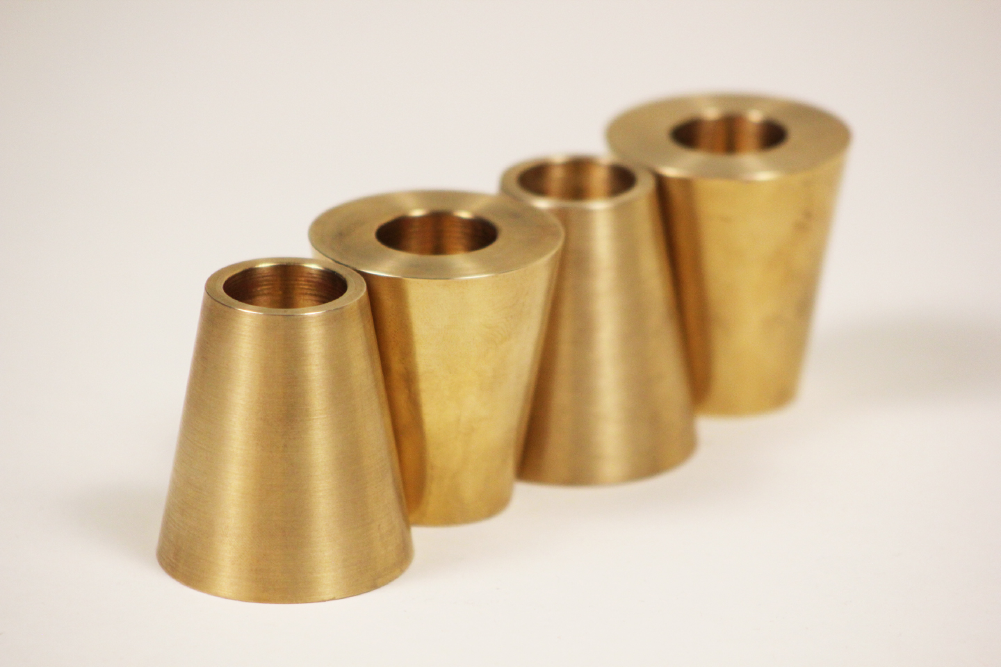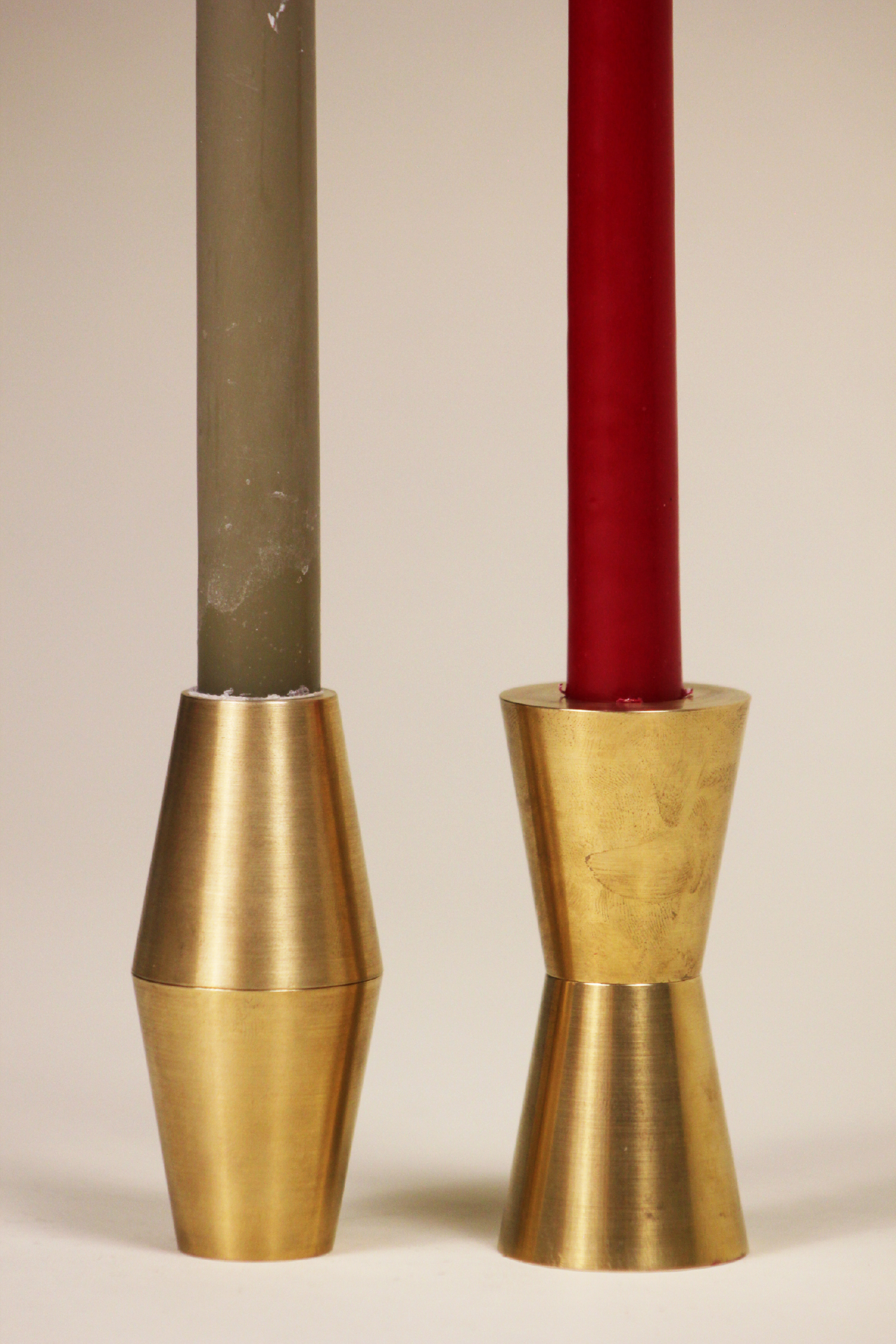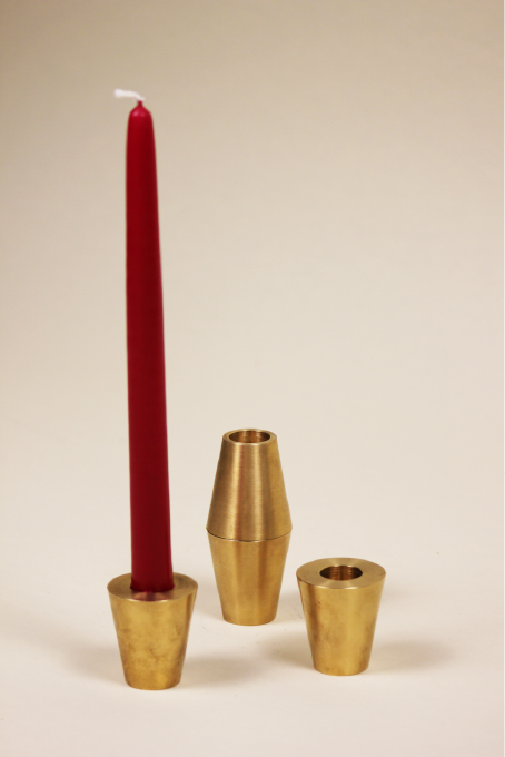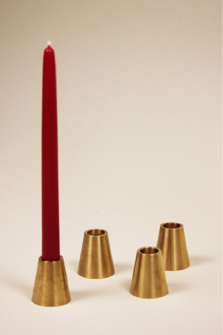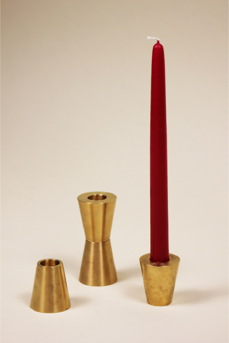 The CANDLE CONE explores the versatility of a simple shape. A solid brass cone with two holes at each end functions as a candle holder. When paired, two cones can be combined in various ways to change their appearance. Simply use an old wine cork to keep them together
