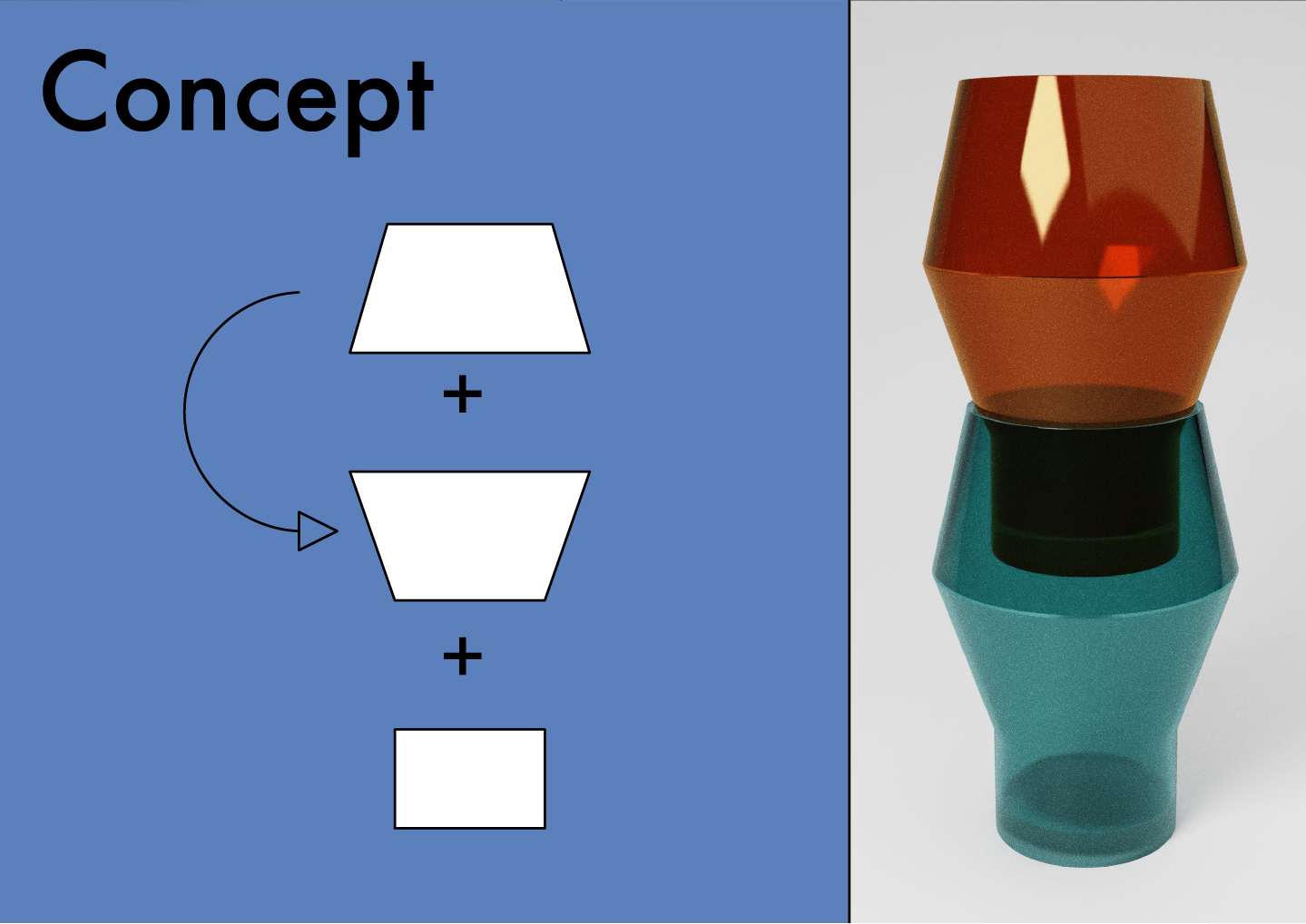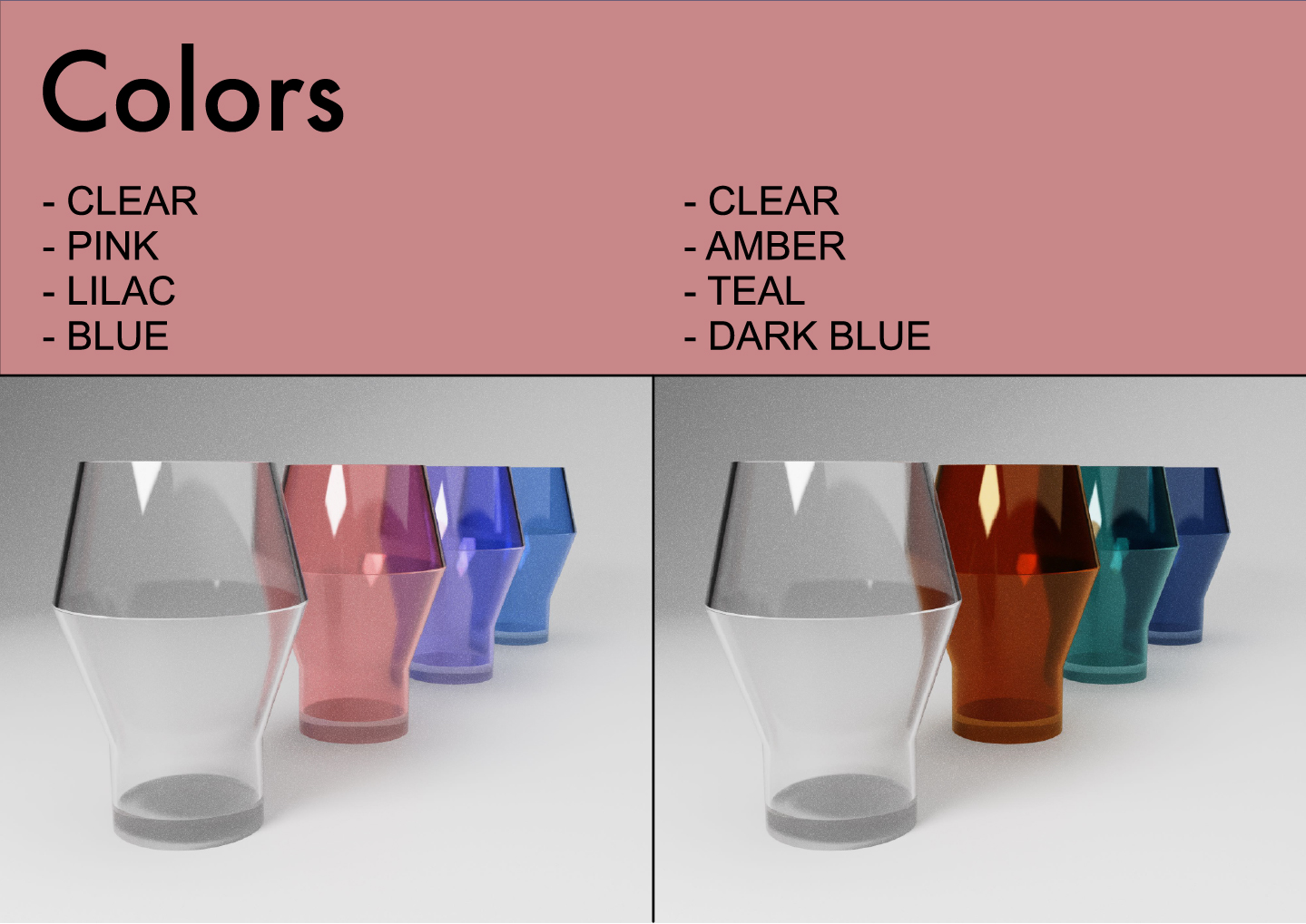 In response to an open call from the Italian brand Traga, our goal was to design a striking drinking glass with bold forms and colors. Our design incorporates simple shapes reminiscent of brutalist architecture while maintaining functionality. The contoured bottom enhances grip, similar to a wine glass, while the slightly wider opening at the top allows for easy stacking.